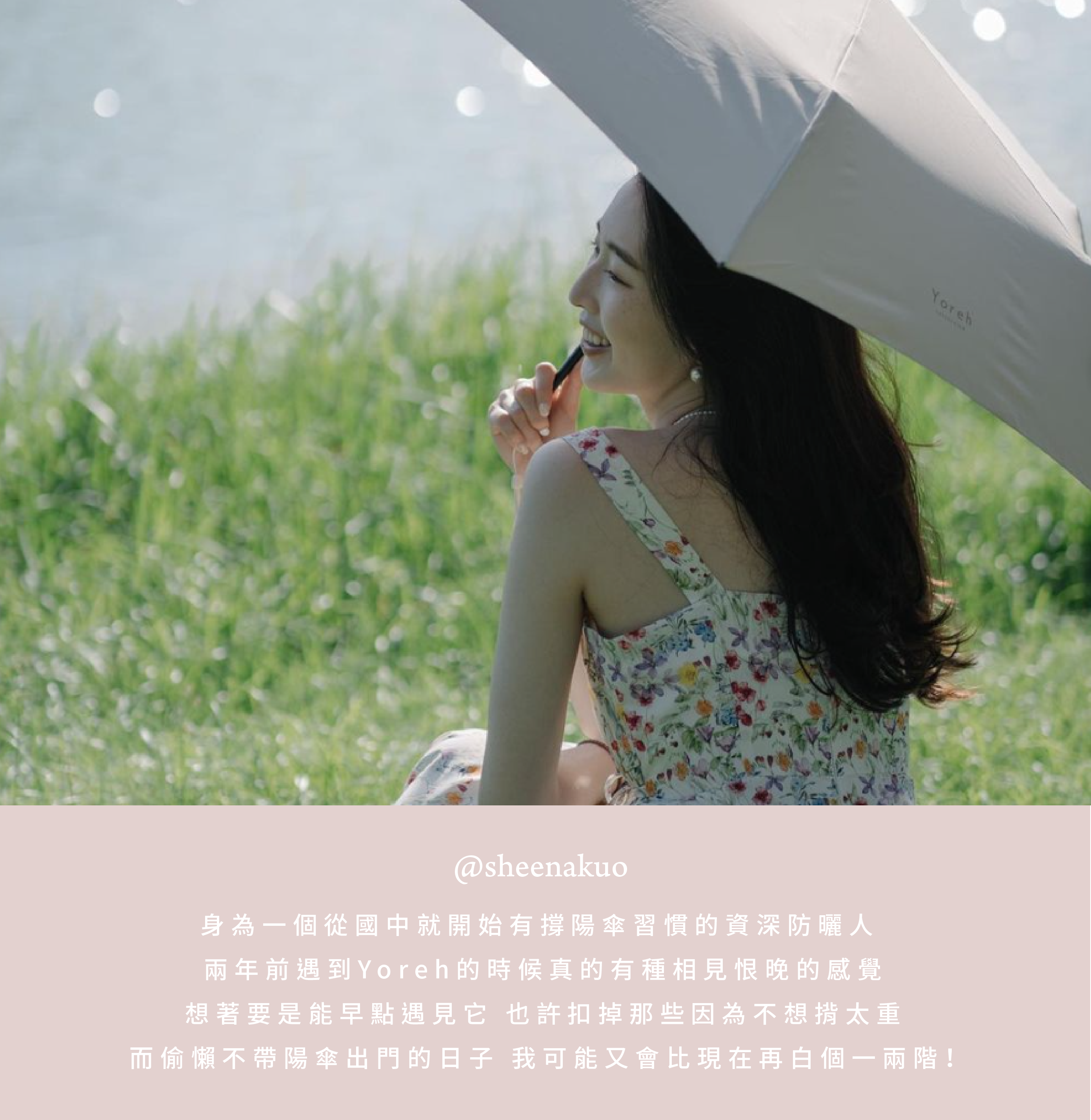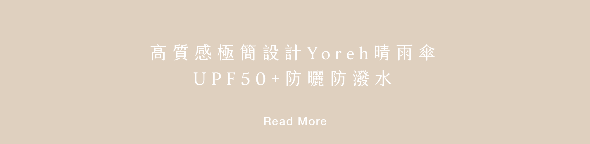 以往認為在傘內裡塗上黑膠才能有效防曬,原因是市面上很多傘使用織線只有190T的傘布,Yoreh家採用台灣福懋的320T陶瓷紗,紗線密度高,本身即防曬及降溫,再透過加工,可抗UV 99.9%,以及奈米防潑水科技塗層,防水效果極佳!