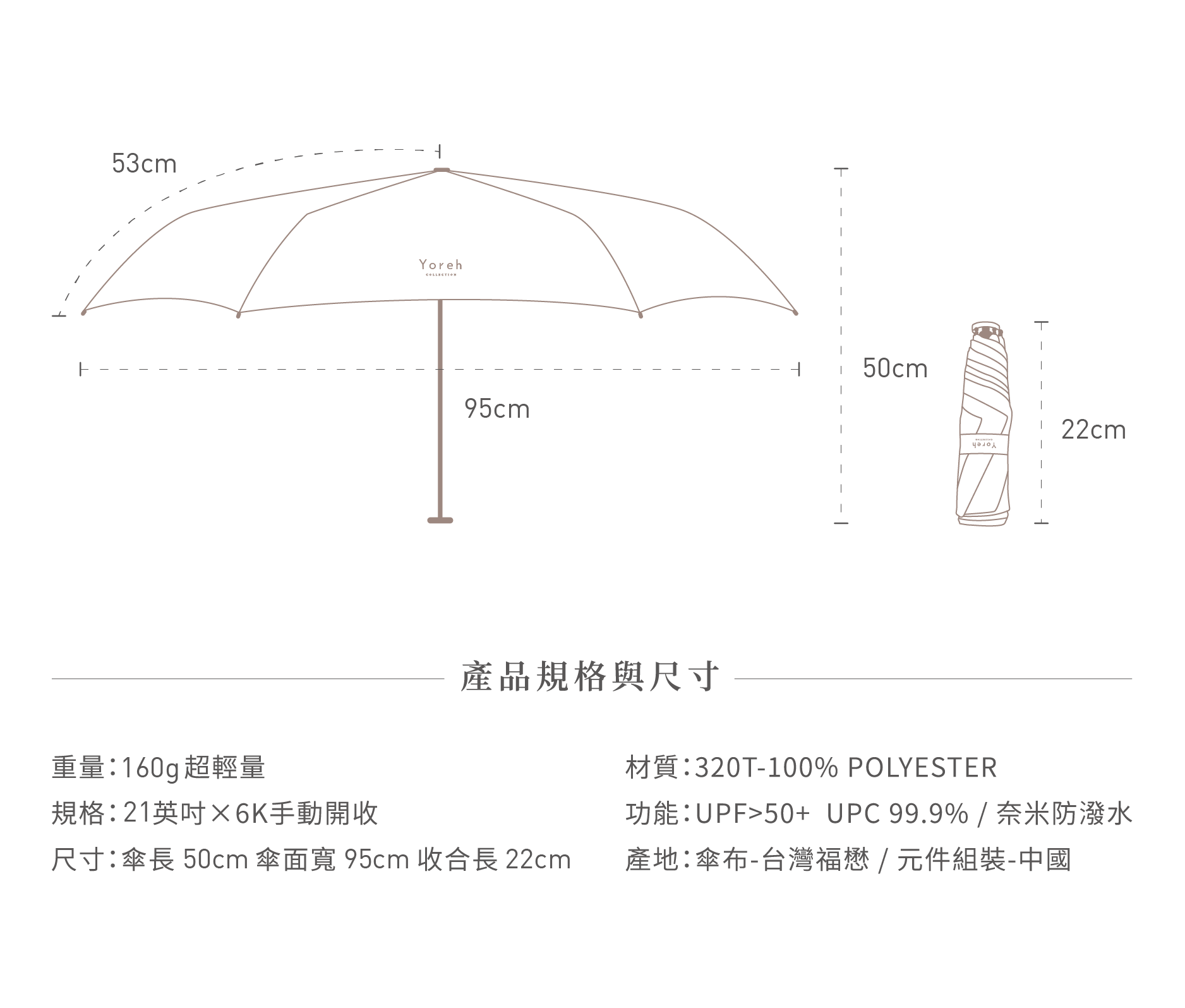 • 320T陶瓷紗傘布,觸感細緻柔軟