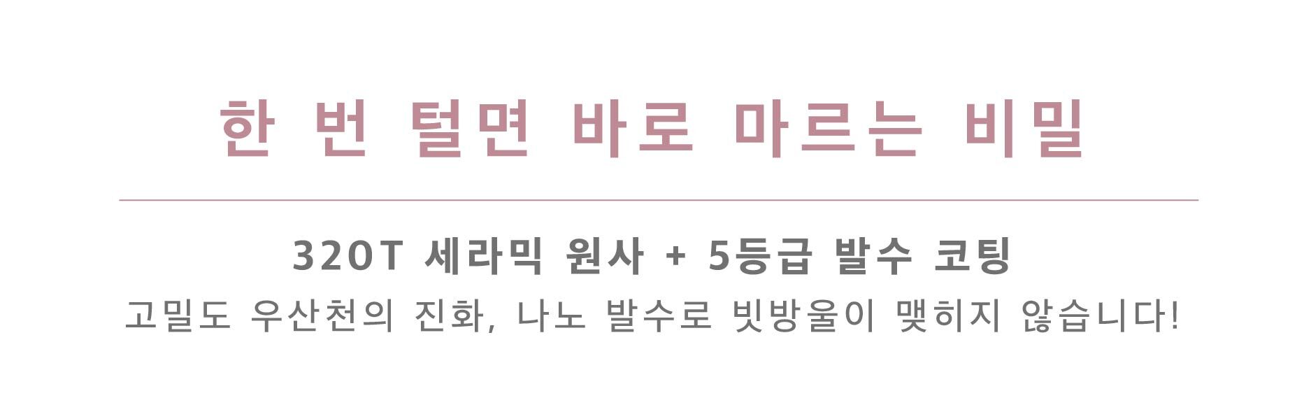 전 라인업에 초고밀도 세라믹 원사를 사용하여 촉감이 섬세하고 부드러우며, 나노급 초발수 성능을 갖추고 있습니다.