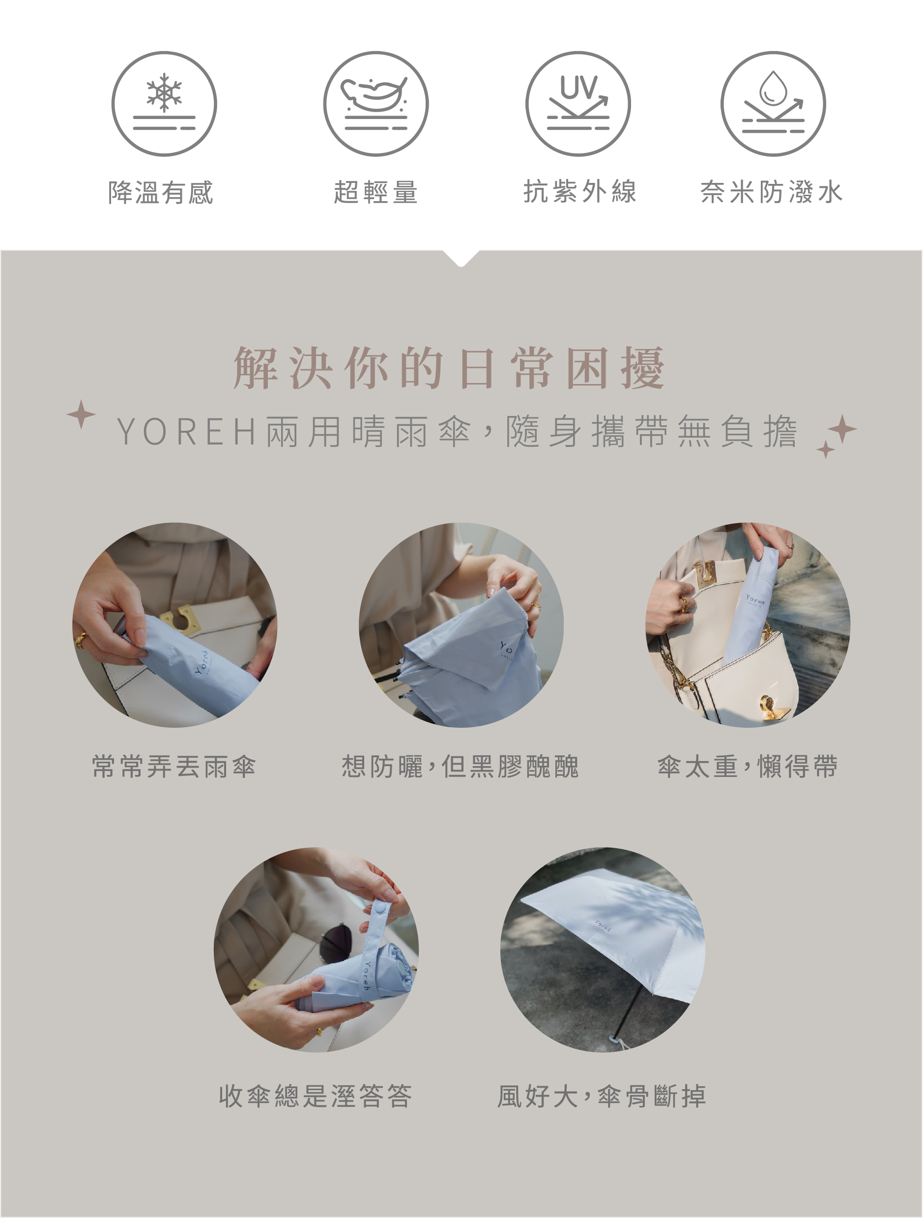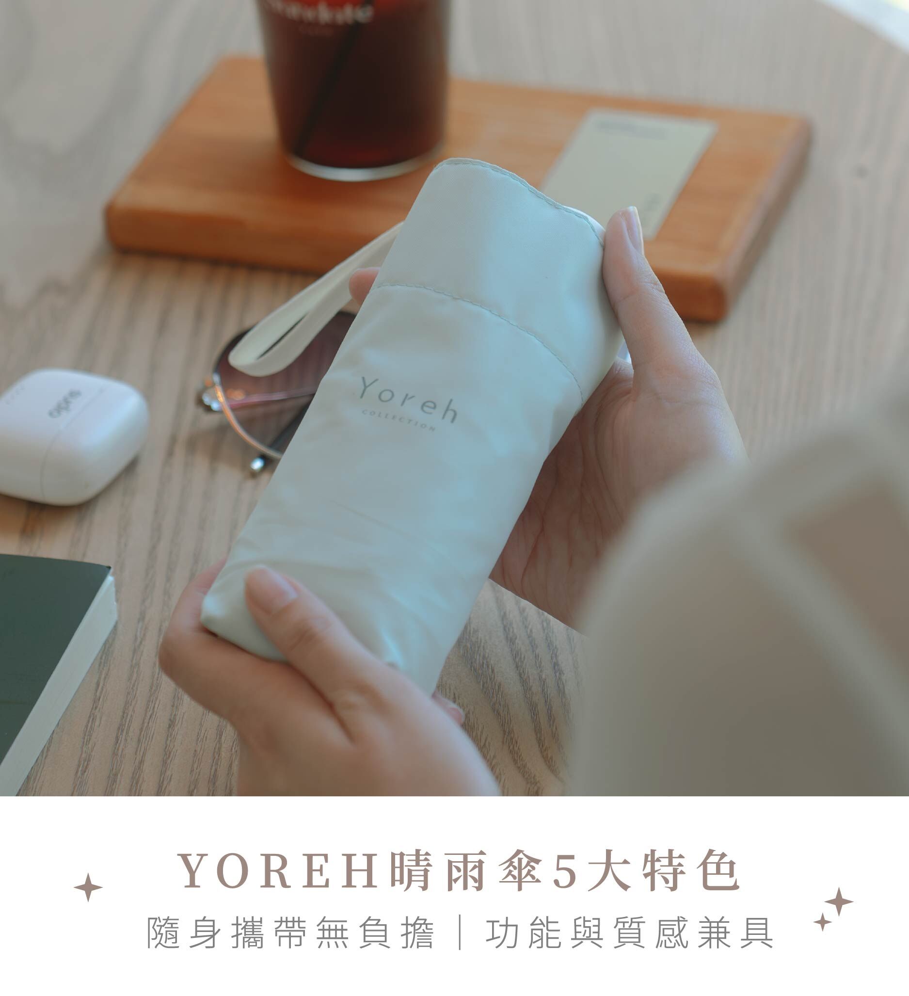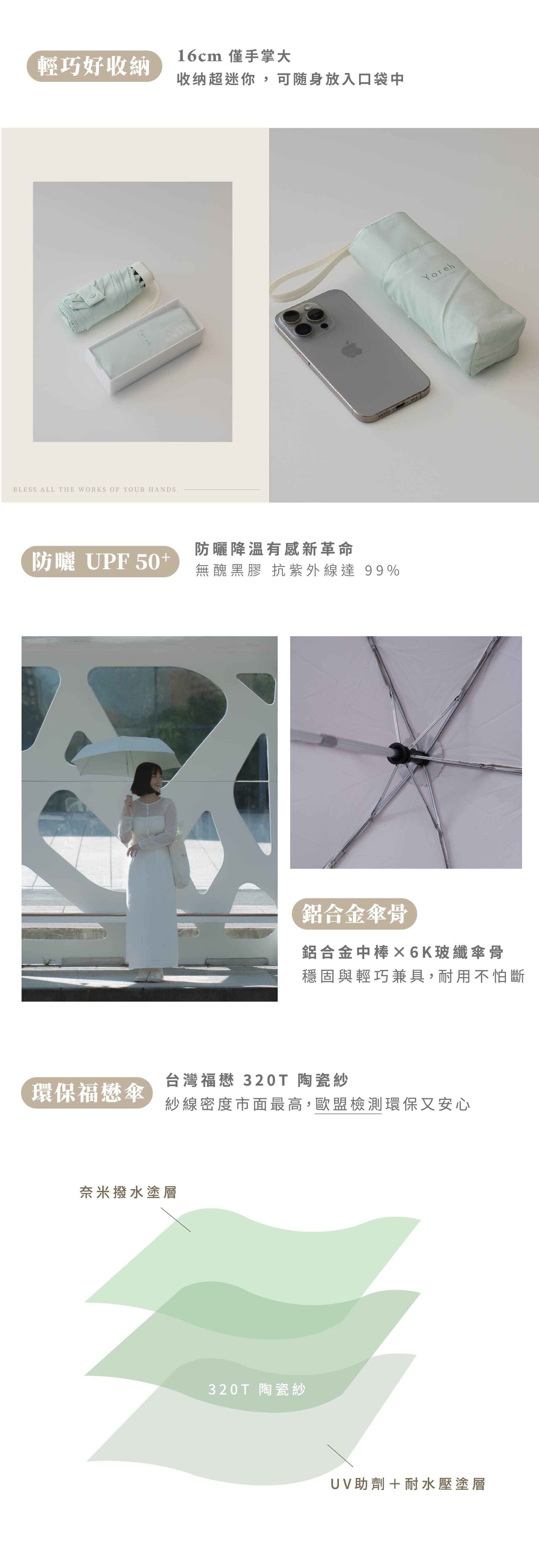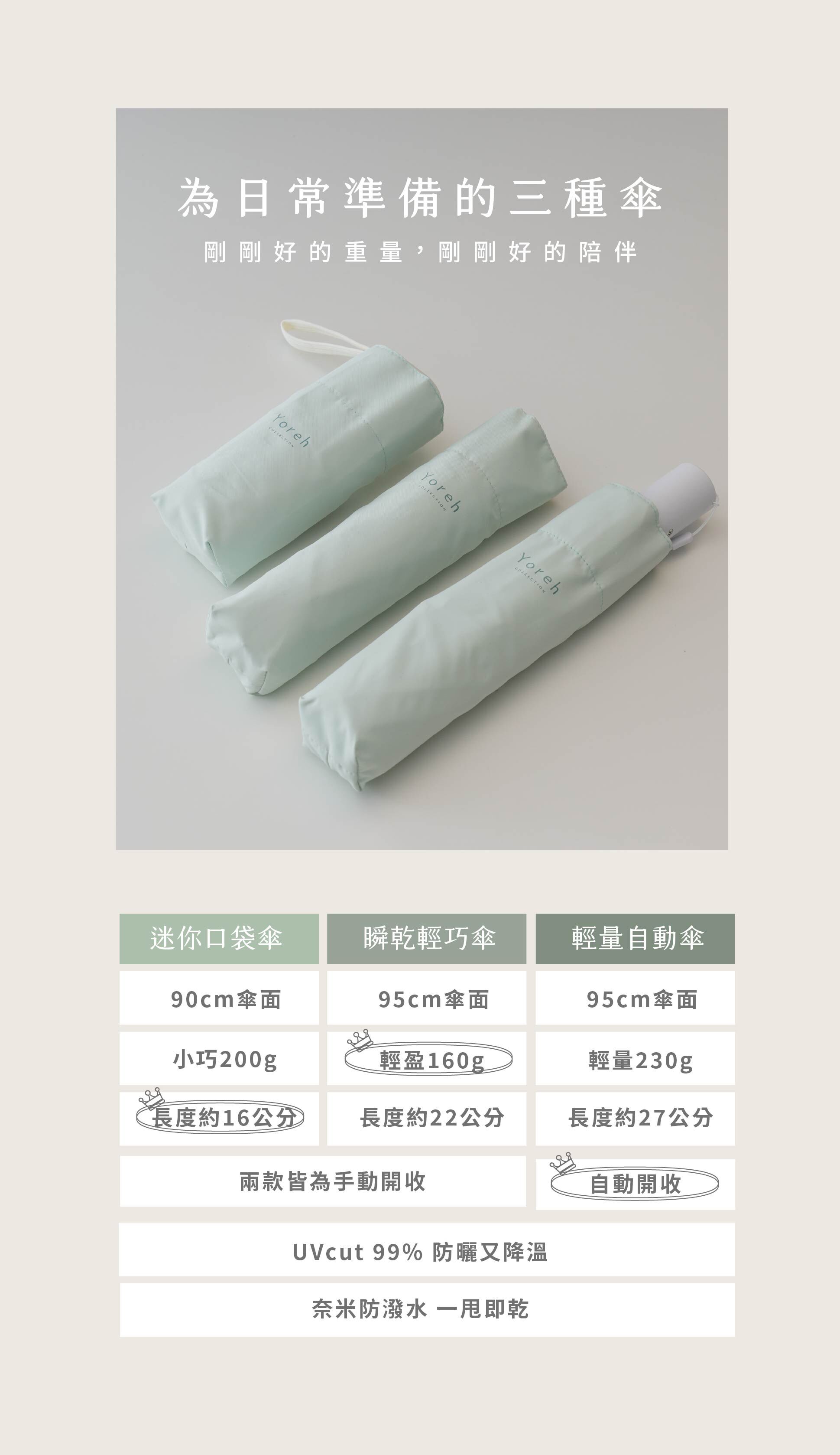 莫蘭迪溫柔綠色調不僅百搭,更賦予產品療癒的質感,是妳夏日防曬與突發陣雨的最強後盾。