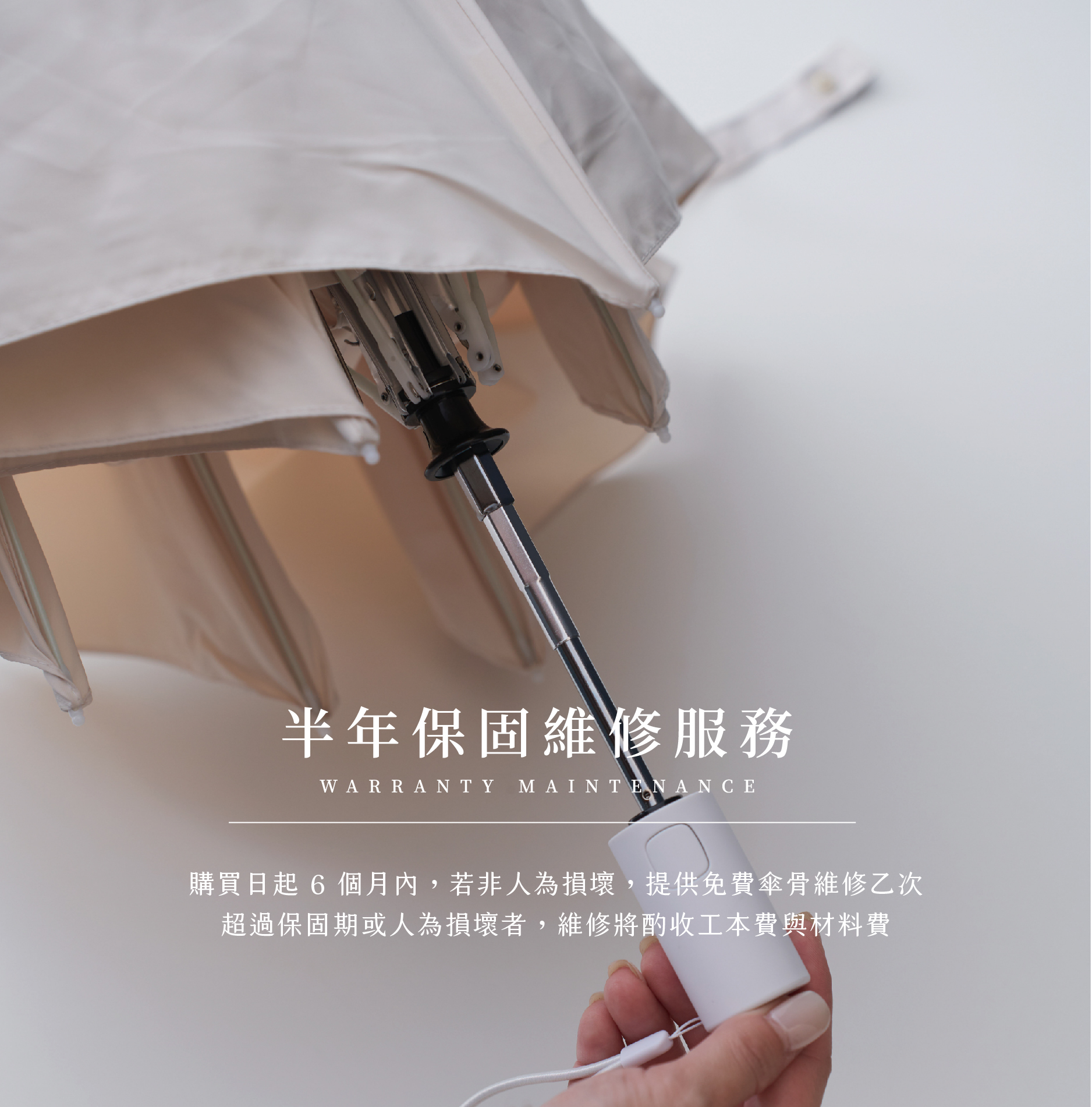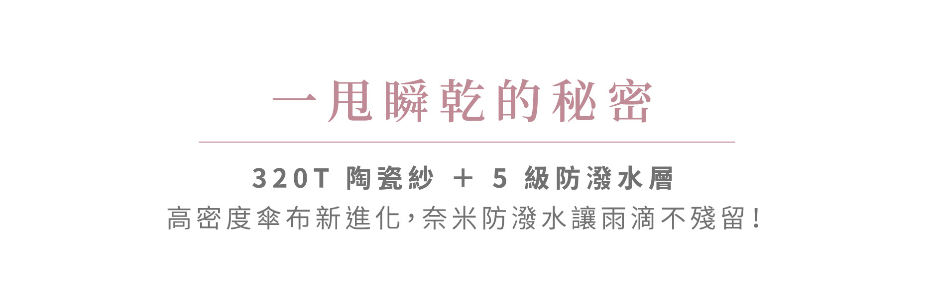 傘面搭配 320T 陶瓷紗布料及瞬乾、抗UV99%塗層,晴天雨天都能守護妳。