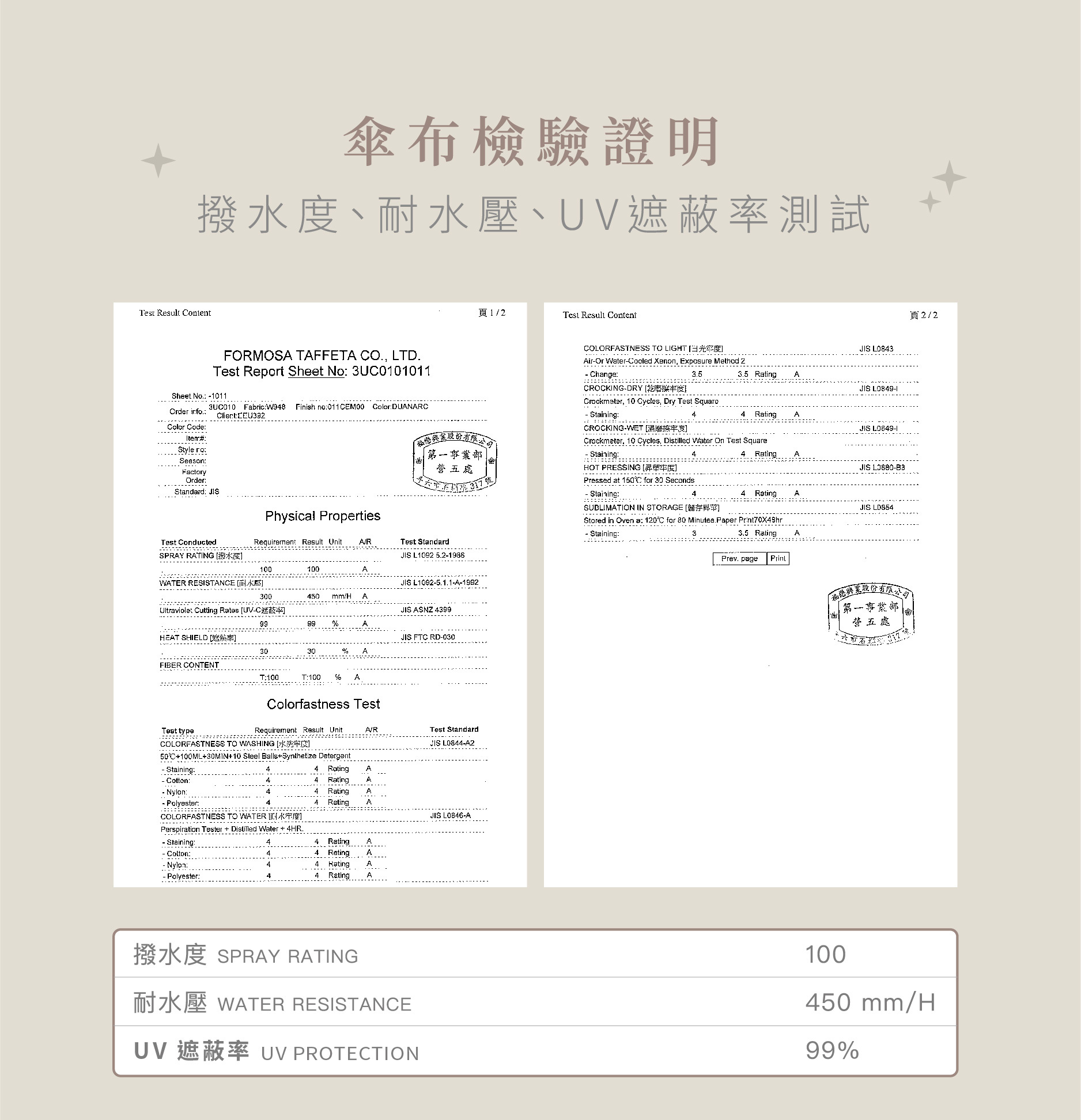 全傘選用細緻超高密度陶瓷紗,搭配頂級奈米防潑水技術,